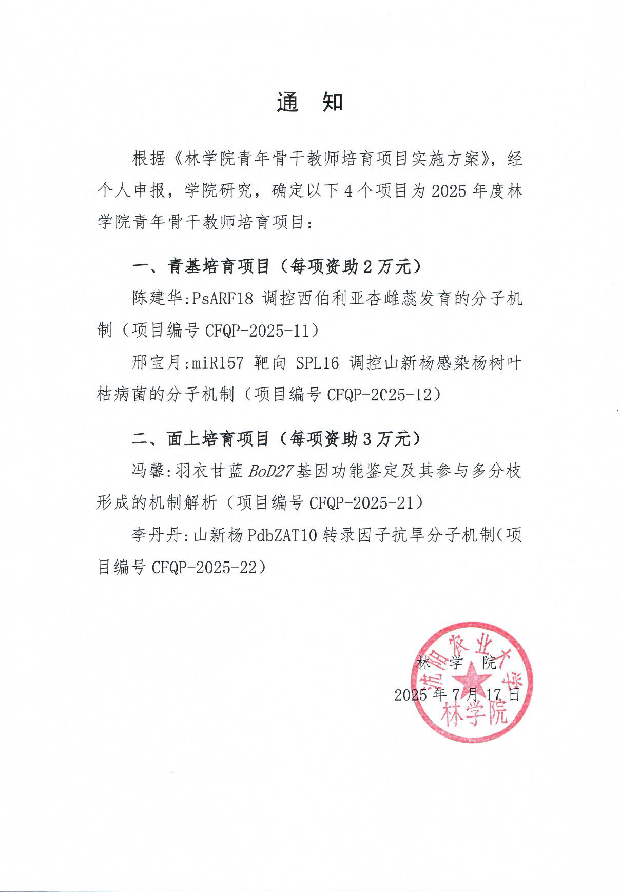 关于公布2025年度「青培项目」遴选结果的通知