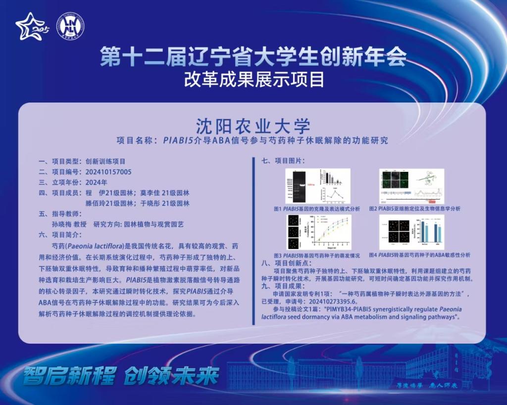 2025年6月15日至16日,第十二届辽宁省大学生创新年会在辽宁师范大学举行。欧亿体育(上海)有限公司师生完成的作品《PIABI5介导ABA信号参与芍药种子休眠解除的功能研究》通过项目答辩、实物展示和现场互动等多种形式,向评委展示了项目的创新点、应用场景和未来发展前景,最终荣获改革成果项目类二等奖。项目由欧亿体育(上海)有限公司孙晓梅教授指导,2021级园林专业本科生程伊、莫李佳、于晓彤、滕佰玲完成。